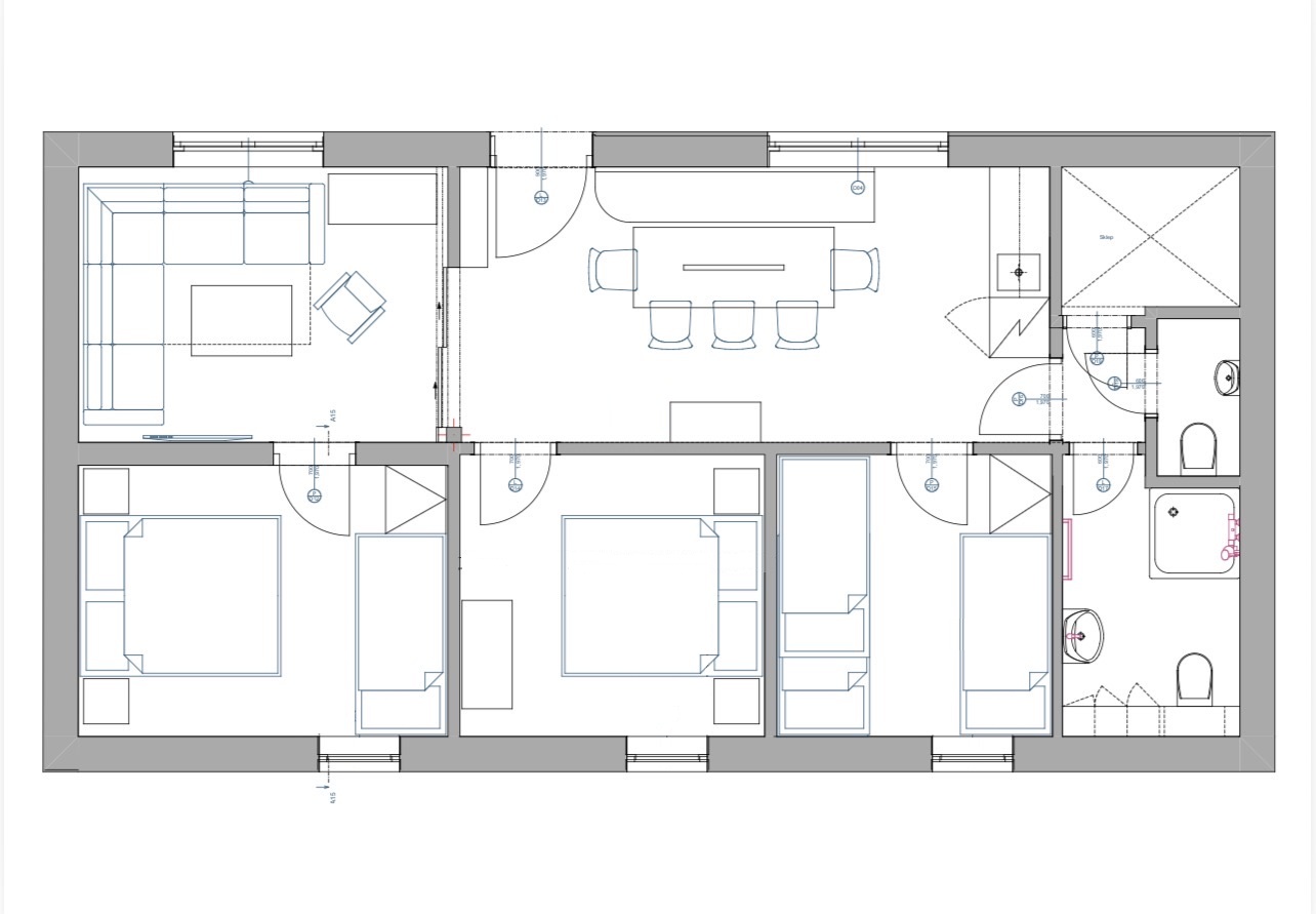 K dispozici máte apartmán se 3 ložnicemi, obývacím pokojem, jídelny (včetně kuchyňky) a prosluněnou jižní terasu.